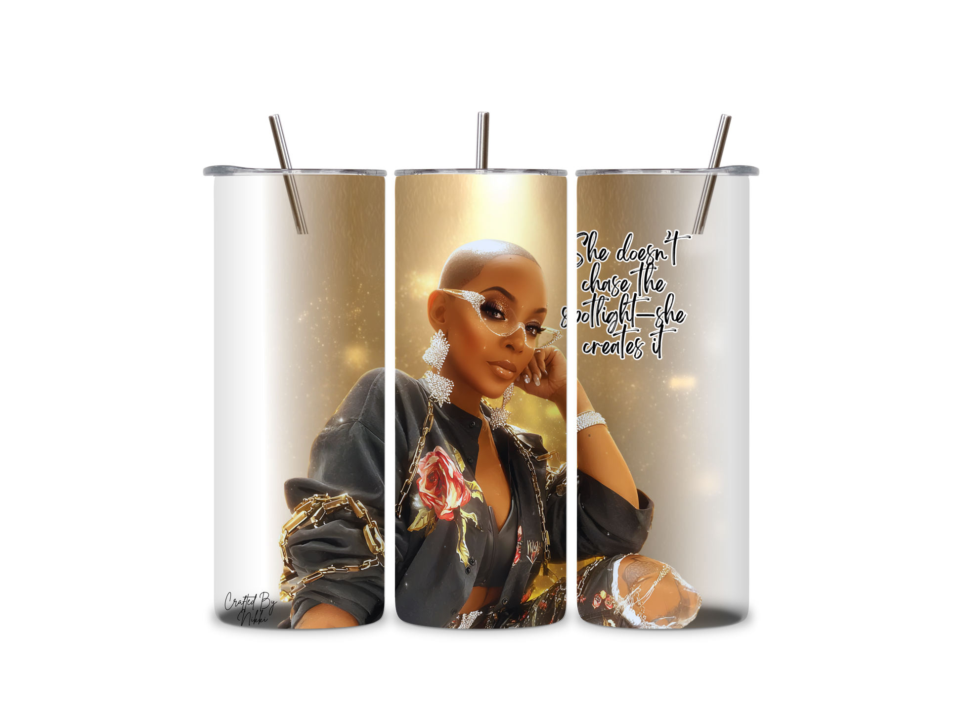 Step into your shine with the Spotlight tumbler from the Bald Baddie Collection. This design celebrates confidence, fire, and unapologetic beauty. Featuring a striking bald queen glowing under golden lights, this tumbler brings luxury and attitude to every sip. The vibrant floral jacket, bold accessories, and soft radiant background create a look that commands the room.